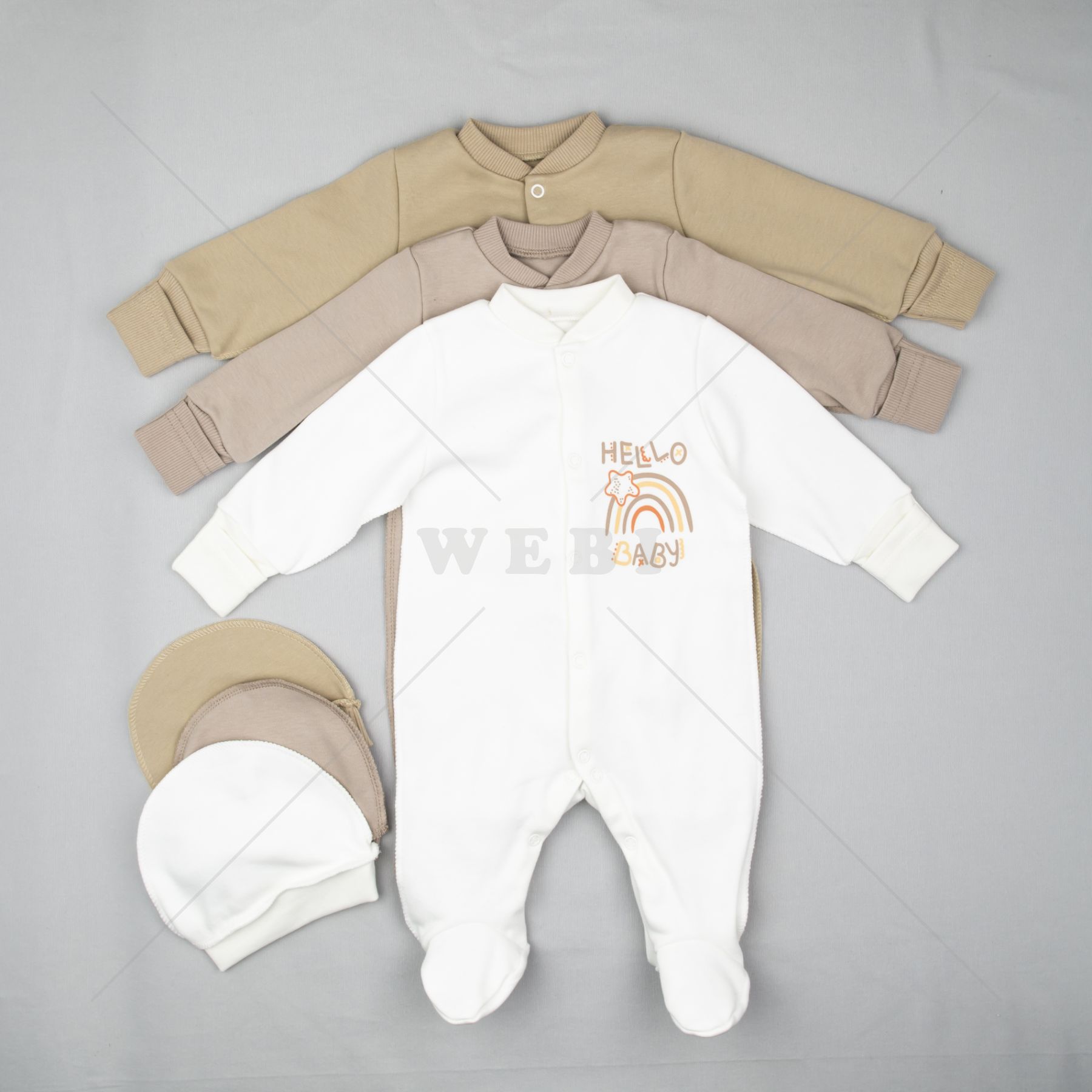 Ніжний комплект із повзунків та шапочки створений для максимального комфорту вашого малюка. Ідеально підходить для перших тижнів життя, дарує тепло, м’якість і затишок.