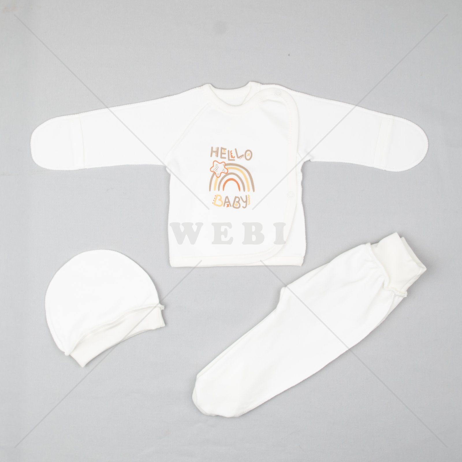 Ніжний комплект із тканини інтерлок пенье створений для щоденного комфорту малюка. Матеріал м’який, дихаючий і гіпоалергенний, ідеально підходить для ніжної шкіри новонароджених.